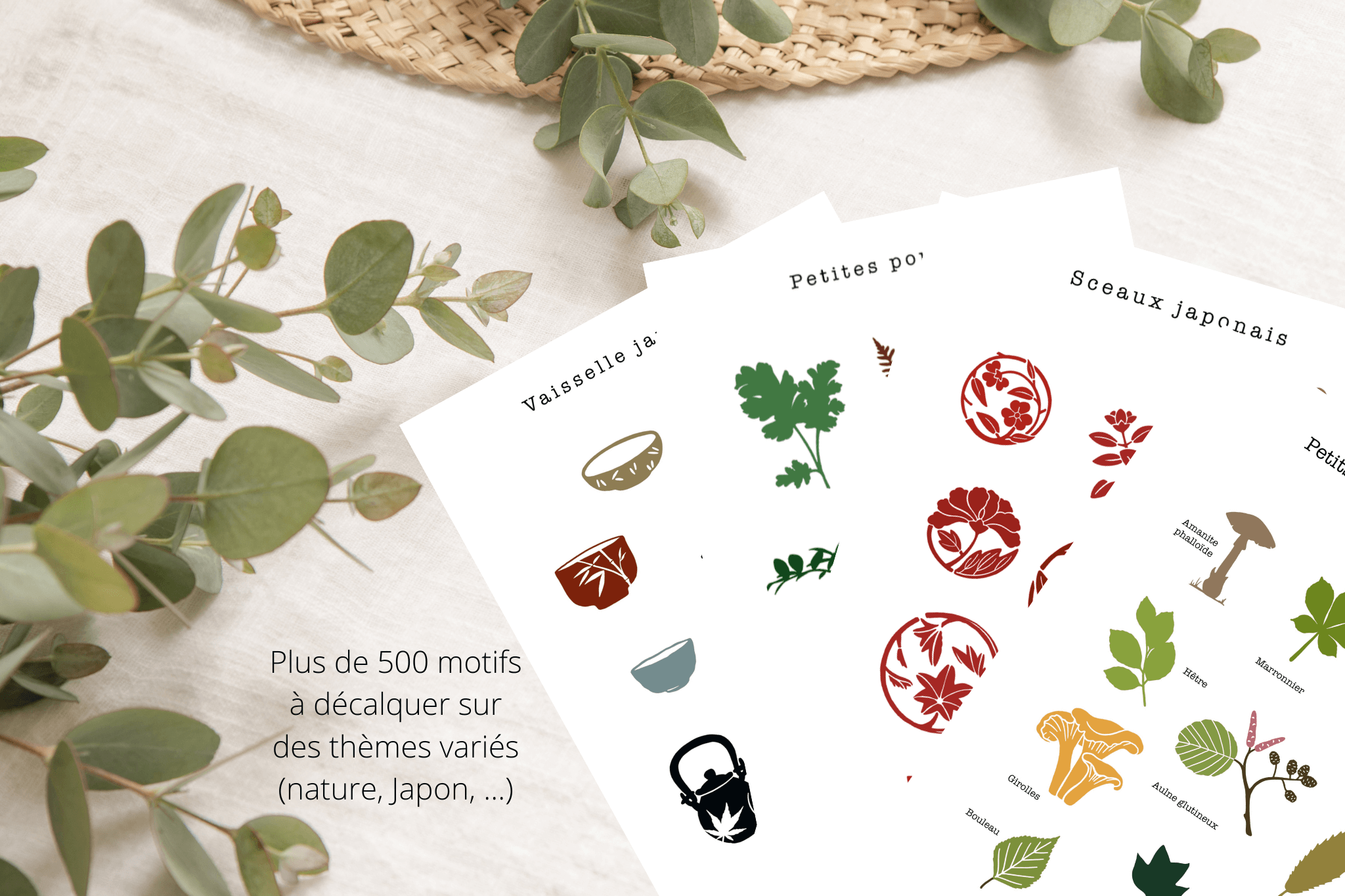 Une bibliothèque de + de 500 jolis motifs sur des thèmes variés que vous pourrez décalquer, avec un index